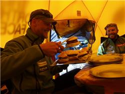 Five of us were taking easy at BC and listening music chosen by the grand old man of the expedition. Every song was covered with universal experiences of life such as technical progress of cassette players. Weather was sunny but unfortunately only 15 minutes after 7am, otherwise clouds and snow kept us in the tent drinking black tea and eatin biscuits.