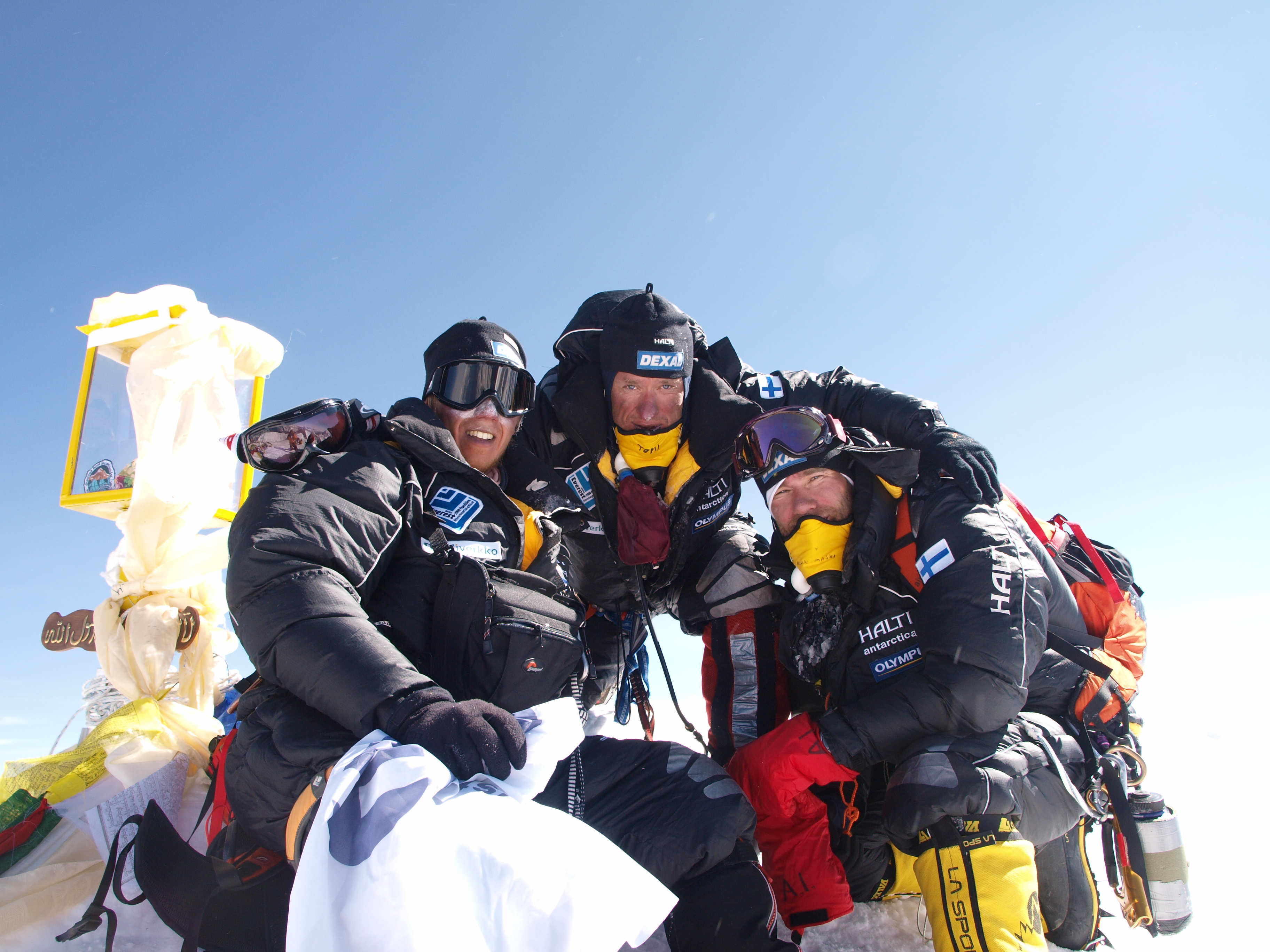 Jussi Rahomaki (vasemmalla), Tomi Myllys ja Antti Inkinen huipulla 8848 m